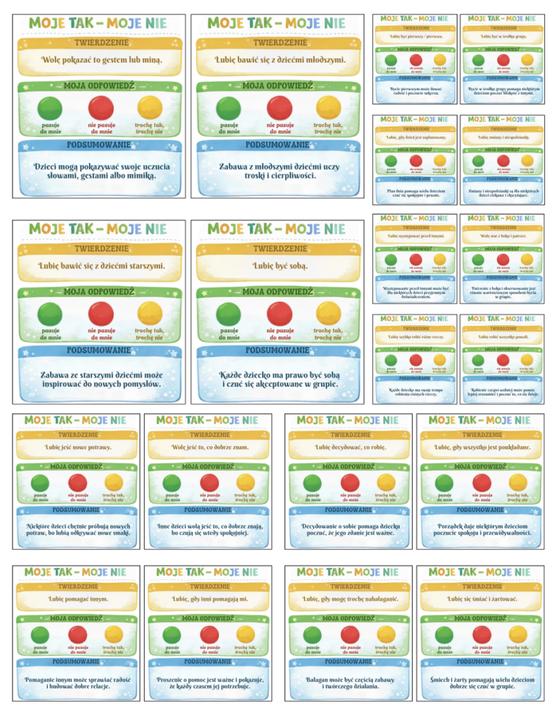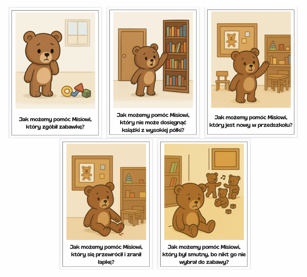 „Opowiedz historię pandy” Zabawa ma na celu rozwijanie umiejętności słuchania innych, respektowania kolejności wypowiedzi oraz wspólnego tworzenia opowieści. Wariant 1 Dzieci pracują w zespołach 3–5-osobowych. Każdy zespół losuje ilustrację z pandą i wspólnie tworzy historię przedstawiającą wydarzenia związane z obrazkiem – określają, co się wydarzyło, kto bierze udział w opowieści oraz jak może się ona […]