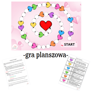 - Pola specjalne – Jeśli pionek stanie na polu z sercem, wspólnie wykonujecie zadanie.