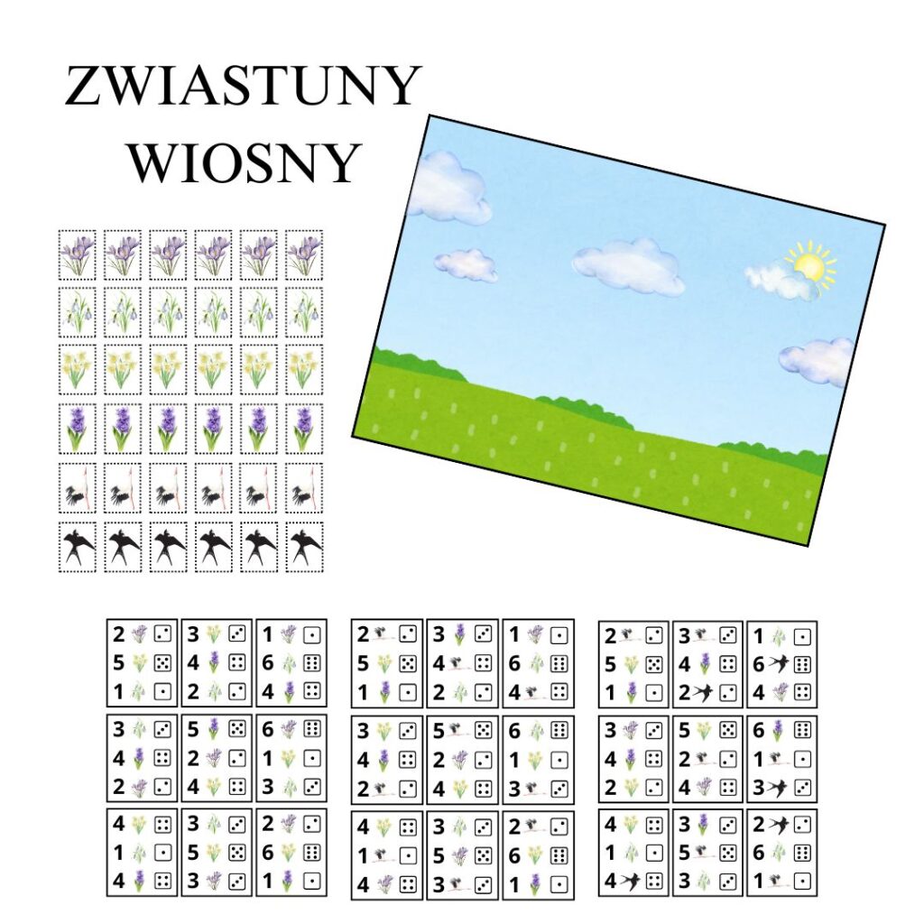 Zabawa matematyczna „ZWIASTUNY WIOSNY” / Materiały, Pomoce Wiosenne kwiaty, czyli zwiastuny wiosny i wracające ptaki to idealny temat na zabawę matematyczną. Zestaw zawiera:Planszę przedstawiającą łąkęKartoniki przedstawiające wiosenne kwiaty i ptakiZakodowane karty Sprawdzam
