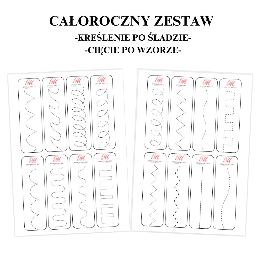 CAŁOROCZNY ZESTAW DO ĆWICZEŃ GRAFOMOTORYCZNYCH I/LUB NAUKI POSŁUGIWANIA SIĘ NOŻYCZKAMI Doskonały zestaw do aktywności dla dzieci, który rozwija motorykę małą: kreślenie …