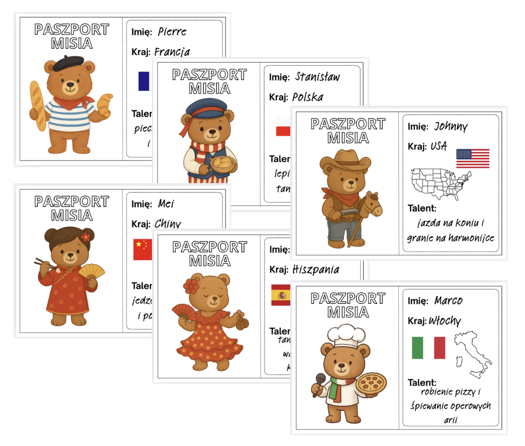 Światowy Dzień Pluszowego Misia Każdy paszport to karta przedstawiająca misia z innego kraju, jego imię, pochodzenie oraz talent lub charakterystyczną aktywność.Dzieci poznają …
